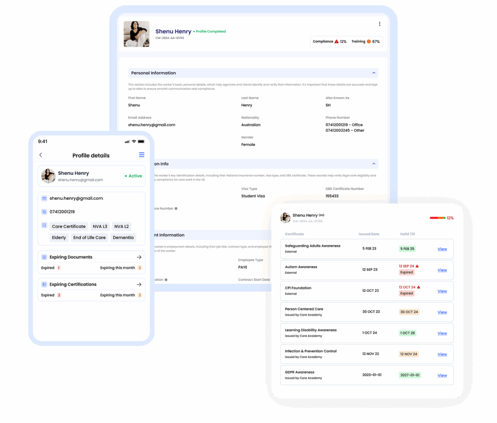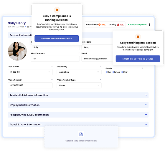 Store contracts, DBS checks, Visas and training proof in a secure central hub. Every document stays compliant, traceable and instantly accessible.