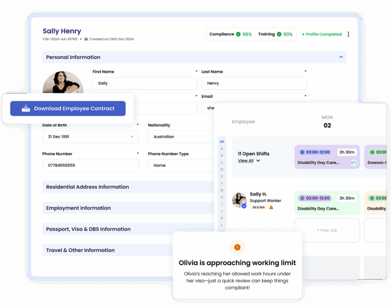Never miss an expiry again. Smart alerts monitor work eligibility and visa limits automatically, enforcing scheduling rules before issues become problems.